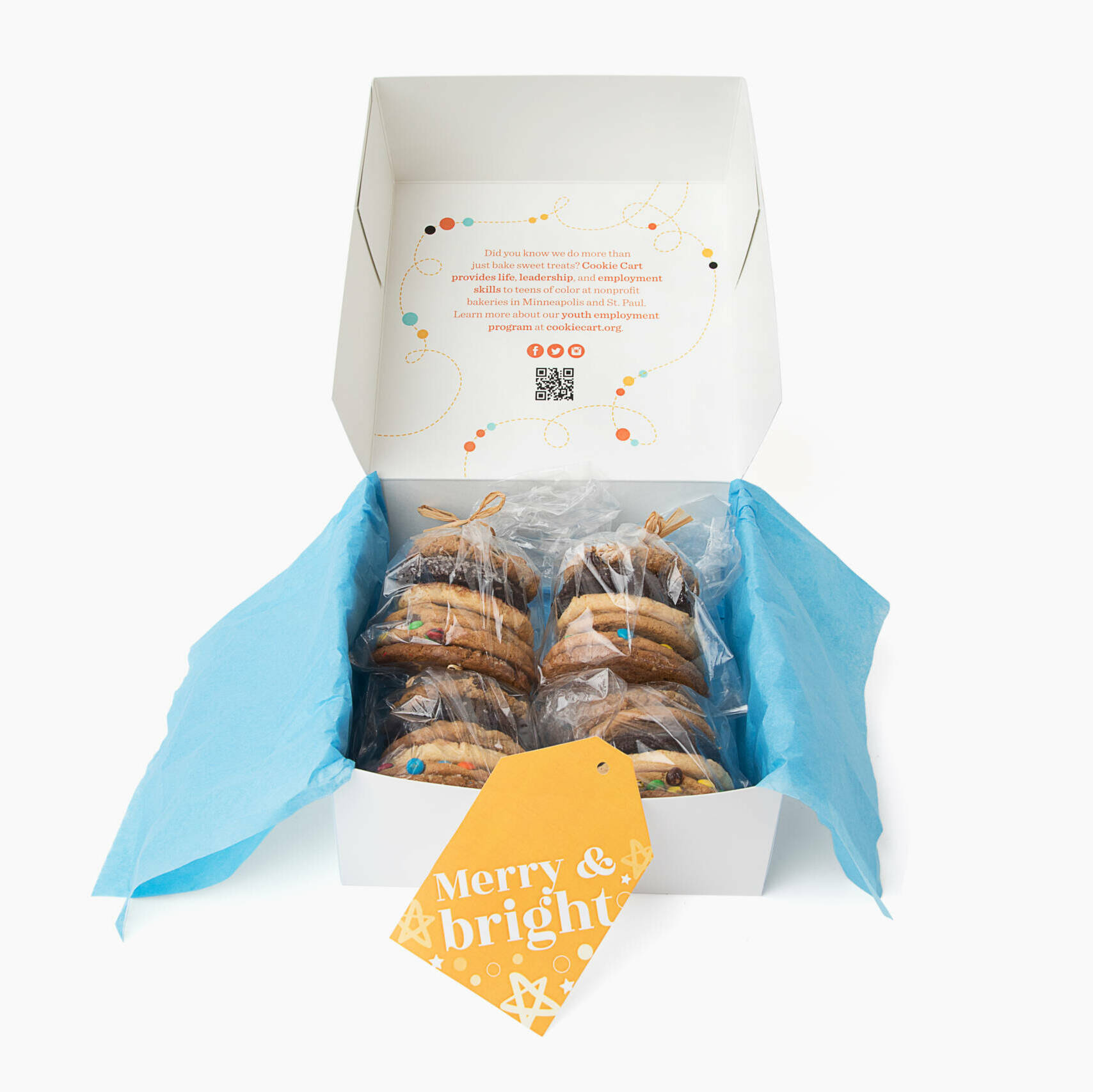 Send seasonal sparkle with a 2 dozen bakery sampler of our traditional cookies packaged in a brand-new, seasonal Cookie Cart box.
